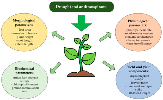 Both drought and the application of antitranspirants can affect plant parameters such as morphological, physiological, biochemical, yield, and yield components (Figure 2). The morphological ones include elements such as leaf area, number of leaves, plant height, stem width, stem length, as well as other species-specific growth characteristics that can be inhibited under drought. Furthermore, one of the main plant responses to this stress is stomatal closure, which reduces photosynthesis [25]. Changes in photosynthesis are categorized as physiological response. Besides this, it also includes relative water content (RWC), leaf water potential, stomatal conductance, CO2 assimilation and transpiration rate, among others. In addition, an important aspect concerning drought is also the plant response, which includes biochemical aspects such as, for example, antioxidant enzyme activity and chlorophyll content. However, from the farmers’ point of view, one of the most important groups of parameters affected by drought is the last one comprising yield and its parameters. Elements such as plant dry weight, seed yield, harvest index, number of seeds per spike, and 1000 seed weight, among others, directly affect a crop’s productivity and financial return.