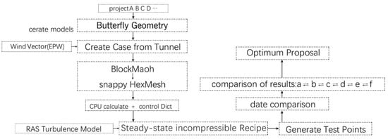 One of the Ladybug tools, an open-source interface that connects the simulation engine OpenFOAM to the Butterfly parametric call platform, was utilized in this study. Butterfly was chosen as the parametric calling platform because it runs stably in the modeling software Rhino, allows data transfer between simulation engines, and enables geometric model creation, simulation, and visualization in one interface. Butterfly is, therefore, widely used to simulate urban wind patterns, outdoor wind simulations, thermal comfort, and indoor ventilation simulations. Figure 1 depicts the technical procedures used to carry out this research.