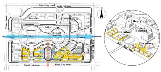 This study takes as an example a university project under construction in Xi’an, Shaanxi Province, China, that covers a total planning area of 69.52 hectares. The campus forms an east–west axis with three buildings, namely, the library, the research building, and the office building. The rest of the teaching and living buildings are arranged in clusters along the north and south sides. The dormitory, depicted in yellow in Figure 2, comprises five clusters, with a planned total area of 22.93 hectares. These clusters are arranged along the east–west axis, with the sports playing field as the central location.