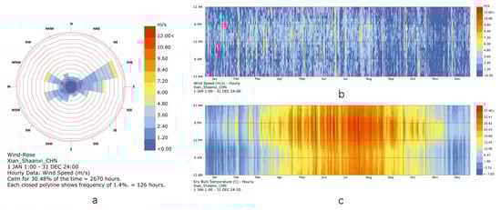 Xi’an, Shaanxi Province, is in a cold climatic zone in the monsoon region of China [,], between 33.42 and 34.45 degrees north and 107.40 and 109.49 degrees east. The annual average temperature in Xi’an is 13.3 °C. The average temperature of the hottest month is 26.68 °C, and that of the coldest month is −0.35 °C. The dominant wind direction in summer is northeast, and the dominant wind direction in winter is southwest []. The wind speed is within the range of 0~8 m/s, with 0~3 m/s accounting for 76% of the year. The average wind speed throughout the year is 1.8 m/s and the region is windless and light most of the time (Figure 3). The EPW meteorological file and wind environment parameter settings in Xi’n are shown in Figure 4.