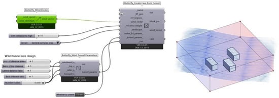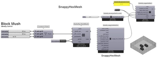 Fluent, Phoenics, OpenFOAM, and other commonly used CFD simulation software are among those found in the literature on wind environment simulations of campus buildings. General CFD software such as OpenFOAM 9 requires a higher theoretical basis for users. More importantly, simple CFD software pays more attention to the solving process, and there still needs to be improvements in the design and optimization of modeling software. The Rhino/Grasshopper platform’s parametric design method has gained popularity in architectural design due to its rigorous logic, simulation visibility, and quantitative correlation. As a result, it is now being applied to simulate physical building environments [,,]. Grasshopper can accurately quantify the relationship between form and performance by controlling various parameters, such as the building’s shape and the surrounding environment. It can perform coupling calculations based on the same model for energy consumption, wind, light, and comfort. Butterfly is a plugin of Ladybug tools and a python library to create and run advanced CFD simulations using OpenFOAM (open-source field operation and manipulation). It is available in the Rhino modeling software to help architects with basic indoor and outdoor ventilation calculations. The Butterfly plugin calls OpenFOAM to create and run CFD simulations. OpenFOAM is the most widely used open-source CFD engine available, capable of running multiple advanced simulation and turbulence models with high accuracy and feasibility. Compared with the existing environmental simulation tools, the building information in the parametric platform has a correlation relationship, and the building model can be adjusted adaptively according to the numerical changes in the design parameters. It is suitable for multischeme comparisons during the creation phase and can significantly shorten the environmental simulation modeling time. Additionally, the high compatibility of the Grasshopper parametric platform makes it ideal for architects to use during the initial design phase for the collaborative calculation of CFD and other performance simulation tools for buildings.