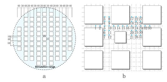 This study used the Architectural Institute of Japan (AIJ)’s standard model of urban-building pedestrian wind environments during the validation phase of the simulation calculation [] (Figure 7). This standard model has a central building size of 25 m × 25 m × 100 m and a prototype size of 40 m × 40 m × 10 m. The reliability of the wind environment simulation method used in this study was demonstrated by comparing the results of the wind tunnel experiments and Butterfly simulations by selecting 33 sets of test points.