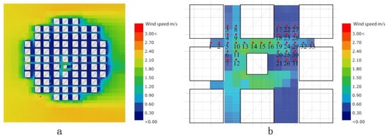 Wind environment simulation of the standard model. (a) Wind environment cloud map at 0° direction. (b) Wind speed cloud map at test point.