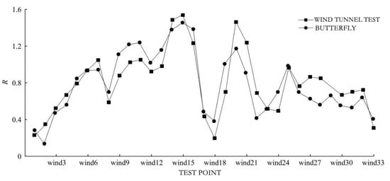 It can be seen that the wind tunnel test and the Butterfly simulation were obtained from the wind speed ratio R-value of each measurement point, with the measurement point of the overall consistency of the law (Figure 9). The average speed ratio error at each measurement point is approximately 12%, according to the examination of the three groups of indicators: root–mean–square error (RMSE), mean absolute percentage error (MAPE), and R-squared. Errors in CFD simulations, errors in the wind tunnel tests themselves, and errors in the complex turbulence in the near-surface region under realistic conditions were analyzed as the sources of errors between numerical simulations and wind tunnel tests. The following conclusions were obtained: