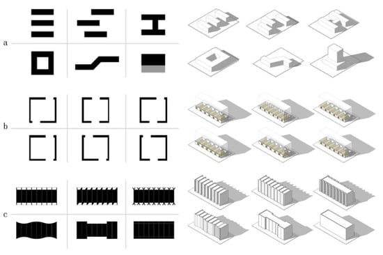 Wind environmental factors. (a) Six groups of plane forms and the shape of building layout. (b) Six groups of plane forms and the position of the room entrance. (c) Six groups of plane forms and shape of building façade form.