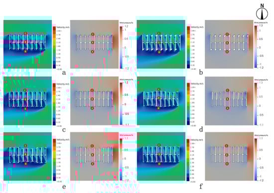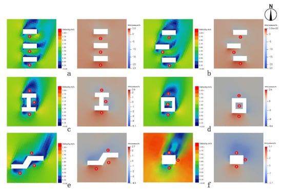 Figure 14. Impacts of different layouts of Group 2 (doors and windows) on wind environment during typical winter periods. (a) Axisymmetric form. (b) Left window and right door form. (c) Left window and middle door form. (d) Right symmetric form. (e) Right window and middle door form. (f) Right window and left door form.