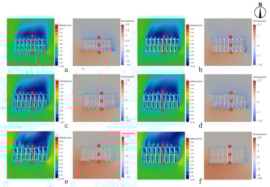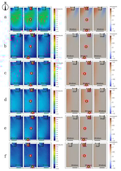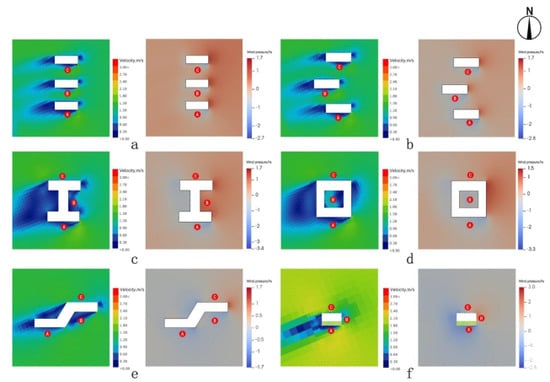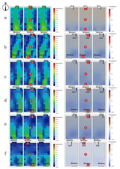 Figure 13. Impacts of different layouts of Group 2 (doors and windows) on wind environment during typical summer periods. (a) Axisymmetric form. (b) Left window and right door form. (c) Left window and middle door form. (d) Right symmetric form. (e) Right window and middle door form. (f) Right window and left door form.