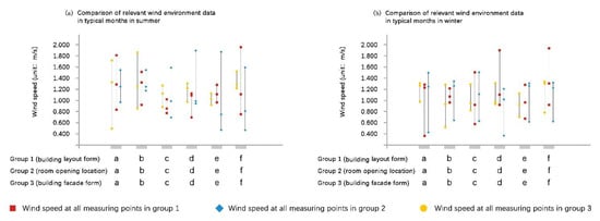 - In the winter environment, types a, b, and f of the building layout do not contain vortex or wind-free zones. Types c, d, and e of the layout form, where wind-free or vortex zones are found in particular areas, are not considered because they are likely to extend the time pollutants spend in the site. The site’s average wind speeds in layout types a and b are 0.935 m/s and 1.099 m/s, which are basically in a breeze or no-wind state. The wind pressure difference in type b is higher than in type a, which can form ventilation quickly. The layout of this group can meet the reasonable working conditions and prevention and control requirements of ventilation in winter (Figure 12, Table 3).
