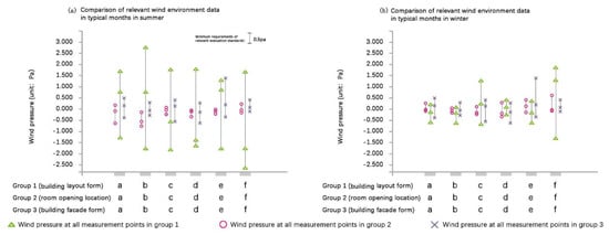 - The building façade forms or spoilers affect the building wind environment. In the summer climatic environment, façade form types b and f have a guiding effect on the wind direction due to the addition of spoilers in the same direction as a southeast wind in summer. Average wind speeds of 1.325 m/s and 1.36 m/s can be achieved, which are optimal. At the same time, all types in the above design achieved a wind pressure difference above the standard 0.5 Pa requirement (Figure 15, Table 6).