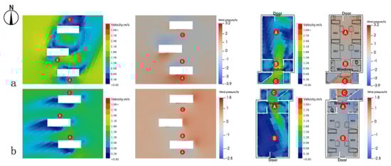 - As shown in Figure 14 and Table 5, although the indoor wind environment of type a of Group 2 (axisymmetric openings) performs well in summer, after opening doors and windows in winter, the interior wind speed distribution is not uniform, and the airflow velocity gradient is large. The average indoor wind speed in winter is 1.163 m/s (>1 m/s []), which will let the user have a strong sense of breeze. In winter, a wind pressure difference of 0.7 Pa (>0.5 Pa []) between indoor and outdoor wind environments causes strong cold air penetration, which has a significant influence on indoor comfort. Combined with the actual use, this study optimizes the design on this basis so that the dormitory can meet the wind environment requirements in winter and summer.