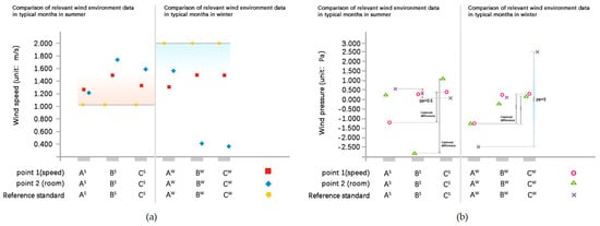 The ideal conditions of summer wind environments in cold areas should meet the relevant requirements of wind environments in the Green Building Evaluation Standard []. Under this standard, there must be no vortex or wind area in the pedestrian activity area of the site at the typical summer wind speed. Moreover, the wind pressure difference between the indoor and outdoor surfaces should be greater than 0.5 Pa. The wind speed at a height of 1.5 m within the pedestrian area around the building should be less than 5 m/s in winter. Furthermore, the wind speed in an outdoor rest area and children’s entertainment area should be less than 2 m/s. Except for the first row of windward buildings, the wind pressure difference between the windward and leeward sides of the building should not be greater than 5 Pa. According to relevant studies, wind speeds ranging from 1 m/s to 5 m/s shall provide good occupant comfort. When the wind speed ranges from 1.5 to 3.3 m/s, it is suitable for people to conduct behavioral activities for a long time []. The comparisons between the simulation results of wind speed and wind pressure and relevant standards are shown in Figure 17 and Figure 18.