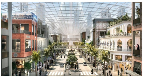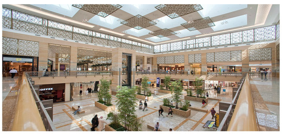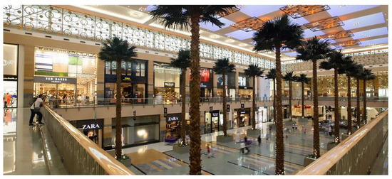 The current population of Dubai stands at 3.34 million, and the city boasts 65 shopping malls, with 10 more currently under construction [1,2]. Upon completion, Dubai Square in Dubai Creek Harbor will be the world’s largest shopping mall [3] (Figure 1). Due to the sweltering hot weather, Dubai residents spend more than 90% of their time indoors [4]. Especially during the long summer months from April through to October, temperatures can soar up to 48 °C with high humidity, making it unbearable to enjoy outdoor activities for more than a few minutes [5,6]. As a result, shopping malls have become de facto community centers and public squares where people gather, enjoy, and experience social events [7]. However, Dubai’s reliance on shopping malls is not solely due to the weather; the city is also shifting towards the hospitality industry and away from its reliance on oil [8,9]. Currently, Dubai is the fourth most visited city in the world, with 16.7 million visitors annually [10]. The Dubai Municipality aims to become the world’s most popular tourist destination by 2025 [11,12]. The Dubai Mall, which had an average of 20 million visitors annually over the past four years, is the most visited mall globally, according to EMAAR’s statistics [13].