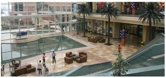 In today’s diverse and complex global cities, consumers demand an active and pleasant environment [14]. Commercial architecture, such as that of shopping malls, plays a crucial role in selling and distributing products and mediating cultural and social activities [15]. Therefore, shopping malls are evolving into multi-functional spaces where people can enjoy life, culture, and leisure, and fulfill various life’s needs [16,17]. To meet consumers’ evolving needs, shopping-mall spaces are being adapted and having their image enhanced; the rest area is one such space. The rest area is a convenient facility that has an impact on the shopping mall’s perception, as it is a free, high-quality service facility accessible to all customers [18,19]. This space stimulates the desire to purchase by increasing user satisfaction beyond the simple pleasure of shopping [20,21]. For consumers, it serves as a place of communication, while, for companies, it increases profits and enhances the shopping mall’s appeal [22,23]. This study aims to investigate the spatial characteristics of indoor and outdoor rest areas in Dubai shopping malls and identify critical factors that enhance user satisfaction for each area. Through literature studies and empirical surveys conducted at the Dubai Mall (Figure 2), Dubai Festival City (Figure 3), and Mirdif City Center (Figure 4), the study identifies the essential elements of indoor and outdoor rest areas that can have an impact on user satisfaction. The study’s findings will provide valuable insights into rest-area planning that reflect user needs and preferences in the future.