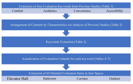 The identified keywords defined specific evaluation contents for each characteristic, focusing on the essential contents for each indoor and outdoor rest area [63]. It was recognized that rest areas had different characteristics and visit purposes, and, thus, the evaluation tool was configured differently for each rest area. As shown in Table 4, it was determined that each rest-space plan required a different evaluation approach, resulting in the derivation of 64 detailed evaluation items across four evaluation categories (comfort, aesthetics, convenience, and accessibility) for four rest-space types (next to the escalator area, next to the bathroom area, open corridor, and outdoor) [64,65,66].
