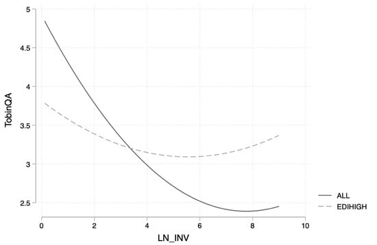 The third condition is to judge whether inflection point values lie within the scope of LN_INV; when = 0, the heavily polluting industry LN_INV value is 4.85, and the value of heavily polluting industry is 3.79, all within the scope of LN_INV. However, Lind and Mehlum [] pointed out that it may not be enough to confirm that the curve is U-shaped even if the above three conditions are met, because there is a certain possibility that the inflection point will exceed the value range when it approaches the boundary of the value range of explanatory variables. Therefore, Lind proposed a sufficient and necessary U-shaped test method and gave confidence intervals for extreme points. As can be seen from Table 6, the extreme value points tested by Lind and Mehlum’s U-shaped test are 4.841 and 3.794, respectively, the 99% confidence intervals of the extreme value points are within the value range, and the null hypothesis can be rejected at the statistical level of 1%. Therefore, it can be determined that no matter whether the industry is heavily polluting or non-heavily polluting, there is a positive U-shaped relationship between environmental protection investment and firm value (Figure 1). In addition, it is worth noting that from the descriptive statistics in Table 3 and Table 4, the mean and median LN_INV of environmental protection investment in heavily polluting industries are 5.21 and 5.3, respectively, and the mean and median of c of non-heavily polluting industries are 4.46 and 4.62, respectively, both of which are greater than the value of LN_INV corresponding to the inflection point of the U-shaped curve. It is proved that environmental protection investment has already exceeded the impairment stage and entered the value-added stage for both heavily polluting enterprises and non-heavily polluting enterprises.