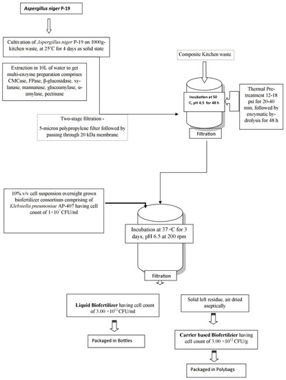 | Kitchen waste | Separate hydrolysis and fermentation for 5 days | Aspergillus niger P-19 and Klebsiella pneumoniae AP-407 | Carrier and liquid biofertilizer formulations with 3.00 × 1012 CFU/g and 3.00 × 1012 CFU/mL, respectively | Kitchen waste management in addition to biofertilizer production improves both plant growth of Tagetes erecta (Marigold) and soil quality | Present study |