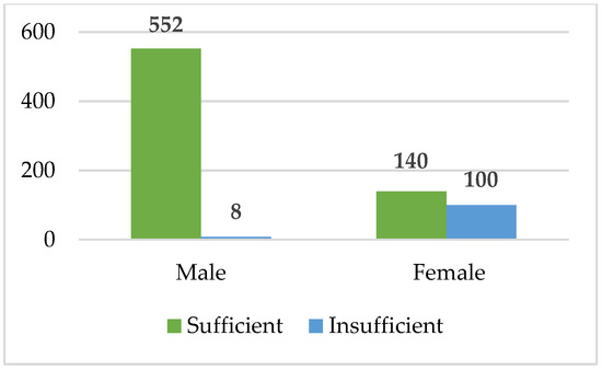 p-value of the test came out to be 0.000, indicating a statistically significant relationship between the studied variables. The strength of the detected dependence was determined by the result of Cramer’s V association measure. Its value was 0.540, which we interpreted as a moderately strong dependence that was statistically significant between the variables gender and sufficient financial evaluation. This result is consistent with the result of the investigation in [