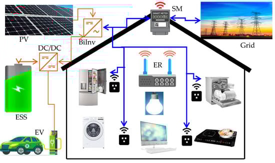 Home energy management (HEM) is used to lower the cost of energy usage and the carbon footprint of end users [7]. There are two basic approaches to accomplish these goals: managing the demand response (DR) and providing electricity to houses via renewable energy resources and energy storage systems (ESSs) [8,9]. The DR program is effective during the time of use (TOU) pricing or incentives that are provided by the utility to encourage users to arrange their usage [10]. Furthermore, the DR must schedule the load with the uncertainty and intermittency of DRE, and DREs and ESSs should primarily confront the home demand. Then, the excess energy may be delivered to the utility, which helps with low carbon emissions [11]. DR programs also help lower peak demand, which minimizes the need for new power plants and transmission lines, leading to cost savings for utilities and customers. HEM is made up of smart meters, routers, and communication systems (e.g., Internet of Things (IoT), wireless networks, and cellular networks) that allow for the monitoring and control of various home appliances and systems (e.g., lighting, heating, cooling, and security systems) via a central hub or mobile device. This technology improves the home’s energy efficiency, convenience, and security [12].