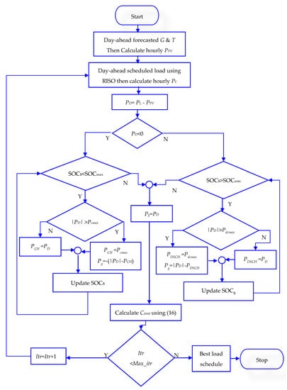 In this section, Figure 2 displays the optimization flowchart. The demand power (PD) from the grid should be zero wherever the generated PV power is enough to feed the load power (PL). However, the surplus power can be first used to charge the battery system if the battery system’s SOC is less than its maximum value, or it can be sold to the grid (Pg = PD) if the SOC is at its maximum value. Otherwise, if the PV power is insufficient, the system will draw power from the batteries to make up the difference. However, if the power from the PV and batteries is insufficient to feed the demand, the power shortage will be purchased from the grid. Using the RISO algorithm to determine the day-ahead schedule of household appliances based on the day-ahead weather forecast energy demand can help reduce energy costs. Within the predetermined time window, the RISO will determine the best time to turn on the appliances for homeowners. The total cost for the scheduled home appliances is determined in (16). The optimization process will continue up until the maximum number of iterations. The best schedule for the load profile is the final result of this flowchart.