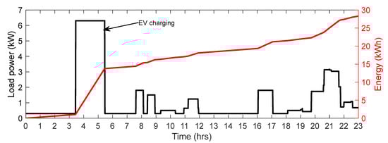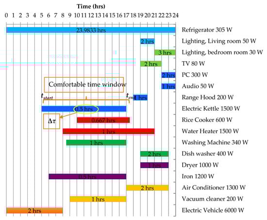 Figure 3 shows some of the common types of household appliances and the preferred time range for them to be used in urban houses in Hong Kong. The prescribed comfort time range is based on people’s common habits and needs to use these appliances. For example, the starting point (tstart) of the range hood appliance is at 5:00 and the end time (tend) is at 17:00, while the duration time of operation is 30 min. The electric vehicle is considered as a household appliance, where it is expected to receive energy in the time range of 00:00 to 9:00 with a duration of 2 h. The hourly load profile for a residential consumer is randomly generated without optimization, as shown in Figure 4. It is clear that the EV charging time interval is 3:30 to 5:30 with a duration time of 2 h. Moreover, the total energy consumption at the end of the day is approximately 29 kWh. For the optimal load profile, the proposed RISO algorithm can be applied to select the best starting time (t*start) in the time range [tstart, tend − Δτ]. Therefore, the proposed method is generalized and flexible enough to be applied to select the optimal operating periods within any comfort time range, which can be suggested by every homeowner.