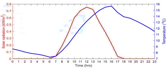 Section 2 describes that the PV power generation varies with the solar irradiation and ambient temperature variations. Therefore, in this study, we employed real hourly data of solar irradiation and temperature in Hong Kong on 1 January 2021, as shown in Figure 5. We assumed that these data are the day-ahead forecasted weather conditions in the winter to test the effectiveness of the proposed HEM. The peak solar radiation is almost 750 W/m2, which occurred at 12:00.
