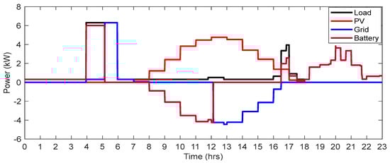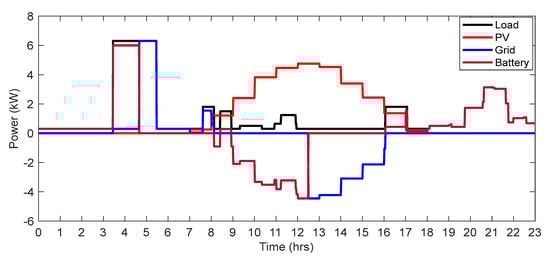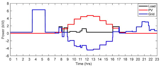 In this scenario, a residential house’s energy sources are presumed to be hybrid photovoltaics (PVs) and the grid, with the load profile being depicted in Figure 4. The load profile includes the charging of an electric vehicle (EV) at a rate of 6 kW for two hours between 3:30 and 5:30 a.m., with the initial state of charge (SOC) being equal to 20% of the total battery capacity (12 kWh). The other household appliances are used according to the house occupation on the weekdays, where the load demand peaks in the morning (7:30 to 9:00) and evening (16:00 to 17:00 and 20:00 to 22:00). The daily energy use is approximately 29 kWh. The capacity of the PV system is 6 kW, which generates electrical power based on the incident solar irradiance and ambient temperature, with the peak power generation occurring during the noon hours. Figure 5 depicts Hong Kong’s sun irradiation and temperature data for January. PV energy is used to meet load demand first, and then the surplus energy is supplied into the grid. However, if the PV power generated is less than the load requirement, the grid will satisfy the load demand, as illustrated in Figure 6. Table 2 summarizes the total energy that is provided to and from the grid. In Hong Kong, the feed-in tariff for power delivered to the grid is 5 HKD/kWh, while the rate for energy acquired from the grid begins at 0.674 HKD/kWh. While the amount of purchased and sold energy is nearly the same, the cost of sold energy is greater to encourage the customers to install solar panels on their homes.