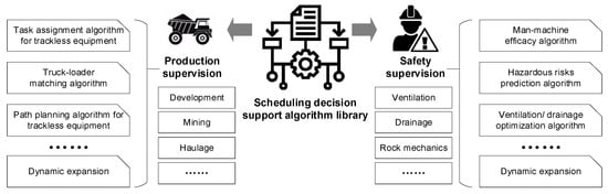 The scheduling decision-making process in underground mines is complex and involves multiple tasks, including development, mining, haulage, ventilation, drainage, and labor scheduling. Traditional methods of decision-making, which rely on manual scheduling of tasks or limited computer-aided techniques, were difficult to obtain optimal solutions for for complex constraints. Therefore, the scheduling decision support algorithm library was developed to improve the scientificity and feasibility of decision-making in underground mines. This library provided interactive decision-making tools for scheduling management entities using machine learning and big data analysis, based on operational progress and monitored big data collected by short interval control.