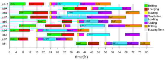 26]: Underground mining is a location-discrete, multi-process, and multi-equipment collaborative production process. This algorithm was used to configure equipment and assign tasks under complex underground mining constraints to rationalize the sequence of operations and maximize efficiency and mining succession. The algorithm could be customized to achieve different objectives, such as the shortest working interval, the maximum productivity, the overall working time, and the maximum equipment utilization rate, according to the preferences of the scheduling management entities.