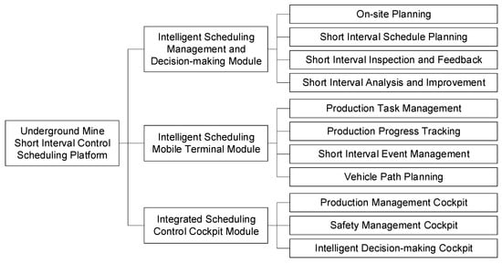 The functional system of the underground mine short interval control scheduling platform included an intelligent scheduling management and decision-making module, an intelligent scheduling mobile terminal module, and an integrated scheduling control cockpit module, as shown in