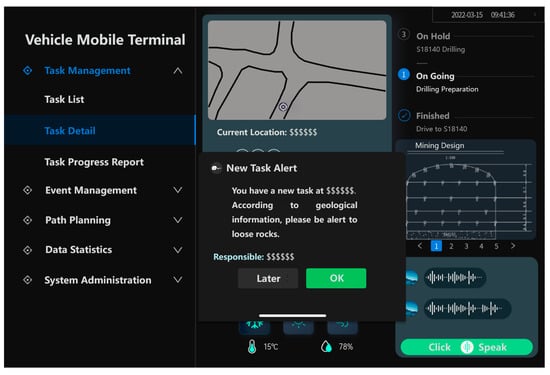 Figure 12. The intelligent scheduling management and decision-making module served the control center personnel and was used to realize scheduling instructions and decisions, mainly completing data collection, scheduling optimization, decision-making, and instruction issuance. The intelligent scheduling mobile terminal module served front-line operators and equipment and was used to realize instruction reception and progress reporting for mining operation entities. The integrated scheduling control cockpit module served the large screen in the control center, conference room, and other scenes and was used to realize virtual simulation space visualization.