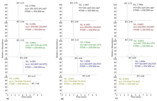Comparative depiction of the SIM-LC-LTQ/Orbitrap MS chromatograms of the antibiotics in PI at concentration 50 μg L−1: (a) injection volume 10 μL, AGC 5 × 105, 0.3% FH; (b) injection volume 10 μL, AGC 5 × 104, 0.3% FH; (c) injection volume 10 μL, AGC 5 × 104, no FH.
