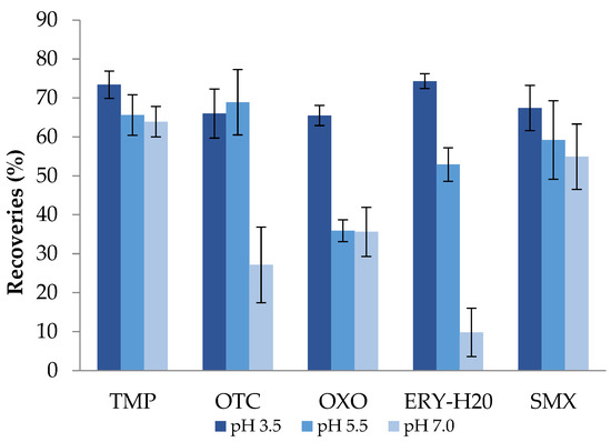 The pH of the sample significantly affects the chemical form of the analytes in the water, their stability, as well as the interaction between the analytes and the sorbent material of the extraction columns. Consequently, for sample preparation it is important to consider the pKa value of each target compound. With regard to the reversed-phase mechanism, analytes should be in their neutral form. Thus, the pH of charged, ionizable compounds should be adjusted to two units above or below the analyte pKa, according to the charged group (basic or acidic compounds) [57]. The pKa (Table S1) of the selected antibiotic compounds range from 1.97 (sulfamethoxazole) to 8.88 (erythromycin)and this is due to the fact that these compounds belong to different groups (tetracyclines, sulfonamides, etc.) which contain acidic and/or basic groups and, therefore, for their ionization, the pH must be adjusted. It is common practice to adjust pH values between 2.0 and 4.0 in the case of multi-residue analyses, whereas few studies exist which do not incorporate pH adjustment. However, in studies involving several water types with different pH values, pH adjustment is preferable when obtaining universal extraction conditions for all samples [56]. Thus, in this study, three different pH values were investigated: 3.5, 5.5, and 7.0 as the best compromise over the selected antibiotics’ properties (pKa values), the type of water samples, the and columns’ sorbent material. The recovery of trimethoprim remained relatively unaffected by the tested pH values, while oxytetracycline presented better recoveries for pH = 5.5 and pH = 3.5. ERY-H2O exhibited improved recovery at acidic pH and especially at pH = 3.5 when compared to neutral pH 7.0, in accordance with the relevant literature [58] (Figure 2). A pH value of 3.5 was selected for antibiotics extraction as the best compromise which is also documented by several authors [59,60].