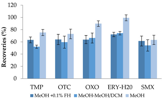 Antibiotics’ recoveries (%) after distilled water extraction using SPE testing of different elution solvent systems (HLB cartridges; pH 3.5).