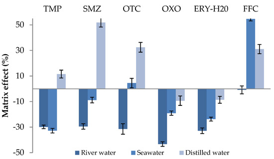 The matrix effect (ME) is generally defined as the combined effect of all the components of which a sample may be composed, in the analytical signal, except for the substances to be determined. It is a substantial concern in LC/MS studies, especially in electrospray mass spectrometry due to the fact that ESI is very liable to other components presence in the sample which may lead to inaccurate results [41]. To estimate the matrix effect, it is necessary to compare the calibration curve slopes derived from the standard solutions and matrix-matched standards (substrate-simulated solutions). Experiments were conducted in triplicates. Slight matrix effect (ME) values (Figure 4) were observed ranging between −20% and 20% in many cases. In river water, the effect of the matrix negatively contributed to the signal response for all compounds except florfenicol for which the effect was not significant. For seawater, all target antibiotics exhibited an insignificant matrix effect, while medium signal suppression was observed for trimethoprim and, on the contrary, signal enhancement was obvious in the case of florfenicol. Finally, when the distilled water was tested for a matrix effect, a slight to strong increase in the signal was observed in the case of sulfamethoxazole.