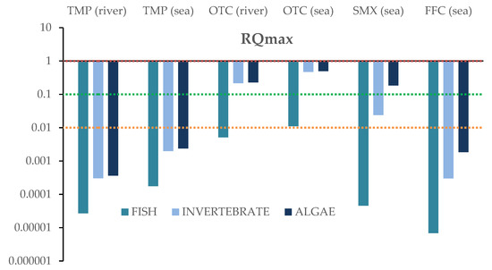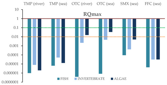 For each compound identified in river and sea samples “based on the worst-case scenario”, the maximum concentration values were used to assess the potential risk posed by the antibiotics on the three trophic levels. The RQs were calculated for acute and chronic exposure. Results for the RQ values for fish, invertebrates and algae are depicted in Figure 6 and Figure 7, and in Table S6. Data concerning acute and chronic toxicity for the target antibiotics are shown in Tables S7 and S8.