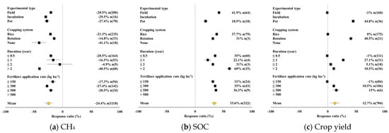Figure 1 shows the effects of the experimental conditions. Across experimental conditions, the CH4 emissions decreased by 24.4%. The CH4 emissions decreased by 29.5% to 20.5%, depending on the experiment type. The greatest reduction in CH4 emissions was observed with incubation experiments (29.5%; 95% CI = 32.5%, 26.5%), followed by pot and field experiments. With regard to the cropping system, the greatest reduction in CH4 emissions was observed without crops (41.1%; 95% CI = 53.8%, 28.4%), and the lowest reduction was observed with crop rotation (14.8%; 95% CI = 17.8%, 11.8%). With regard to the duration of the studies, the effect of biochar application increased significantly when the research period exceeded 2 years (40.5%; 95% CI = 42.5%, 38.5%). With regard to the fertilizer application rate, the greatest reduction in CH4 emissions with biochar application was observed at a rate of 150–300 kg ha−1 (27.4%; 95% CI = 29.4%, 25.4%). Across experimental conditions, the SOC content increased by 36.3% (95% CI = 31.2%, 41.4%). Among experiment types, the increase in SOC content was highest in field experiments (47.7%; 95% CI = 45.7%, 49.7%). Among cropping systems, the increase in SOC content was higher with a single crop (41.9%; 95% CI = 40.9%, 42.9%) than with crop rotation. In regard to the study duration, the increase in SOC content was highest when biochar was applied for more than 2 years (60.0%; 95% CI = 54.9%, 65.1%). Across experimental conditions, the crop yield increased by 12.7% (95% CI = 14.4%, 21.0%). Among experiment types, the increase in crop yield was significant in pot experiments (44.8%; 95% CI = 41.8%, 47.8%), but was not significant in field experiments (−1%). Among cropping systems, the increase in crop yield was greater with crop rotation (40.5%; 95% CI = 36.4%, 44.6%) than with a single crop. The crop yield increased by 5.1–27.1% (95% CI = 2.1%, 8.1% to 24.1%, 30.1%) for study periods lasting for 0.5 years or more. The crop yield also increased with the fertilizer application rate.