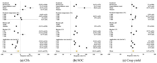 Response of (a) methane (CH4), (b) soil organic carbon (SOC), and (c) crop yield to application of biochar under feedstock, pyrolysis temperature, soil pH, soil C/N, and biochar application rate. Numbers in parentheses represent sample size. The squares in color in the figure caption are an overall average value on properties.
