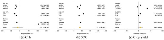 Figure 3 shows the effects of the soil properties. Across the soil properties, the CH4 emissions decreased by 11.3% (95% CI = 41.0%, 14.8%), though the decrease was not significant. Among soil pH values, the greatest reduction in CH4 emissions was observed with alkaline soils (25.9%; 95% CI = 21.8%, 30.0%). Among C/N ratios, the greatest reduction in CH4 emissions was observed at C/N < 10 (28.8%; 95% CI = 22.6%, 25.0%). Among soil types, CH4 emissions decreased in loamy soils (16.5%; 95% CI = 12.4%, 20.6%) but increased in sandy soils (105.4%; 95% CI = 84.5%, 126.3%). Across soil properties, the SOC content increased by 46.2%. The greatest increases in the SOC content were observed in neutral soils (78.6%; 95% CI = 65.9%, 91.3%) and with C/N < 10 (60%). Across soil properties, the crop yield increased by 8.3% (95% CI = −2.2%, 18.8%), though the increase was not significant. The greatest increase in crop yield was observed in alkaline soils (36.3%; 95% CI = 33.3%, 39.3%). The crop yield increased at C/N < 10 (7.3%; 95% CI = 5.3%, 9.3%), but did not differ significantly at C/N ≥ 10 or higher.