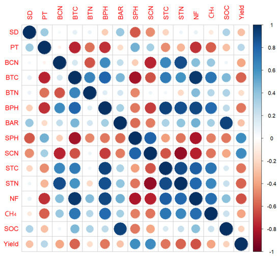 Correlation between RR and influence indicators responding to CH4 emissions, SOC contents, and crop yield. SD, study duration; PT, pyrolysis temperature; BCN, biochar C/N; BTC, biochar total carbon; BTN, biochar total nitrogen; BPH, biochar pH; BAR, biochar application rate; SPH, soil pH; SCN, soil C/N; STC, soil total carbon; STN, soil total nitrogen; NF, nitrogen fertilizer; CH4, ln(RR) of methane emission; SOC, ln(RR) of soil organic carbon contents; yield, ln(RR) of crop production. A blue circle means a positive correlation and a red circle means a negative correlation.