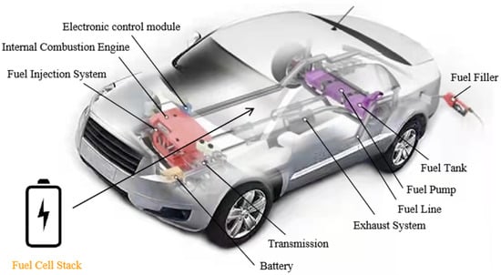 Methanol can be produced from a variety of carbonaceous feedstocks (coal, natural gas, biomass, carbon dioxide, etc.) and is therefore capable of being produced at scale [17,18,19]. It has already been extensively trialed as an alternative fuel in various attempts to reduce dependency on gasoline and diesel [20,21,22,23]. However, methanol, as a convenient liquid fuel for range-extending fuel cells, may also play a role in improving EV performance [16]. The technological route of methanol application in vehicles is to directly inject liquid methanol into vehicles. Figure 1 shows the structural components of a methanol vehicle. However, due to the increase in the heating rate of the power battery packs, the charging/discharging efficiencies, service life and safety of the EV battery packs will be affected, and thermal runaway accidents will occur in some extreme cases [24,25,26,27]. In addition, EVs have a significantly shorter range due to the battery performance degradation in winter [28,29]. According to the China Automotive Consumer Research and Testing Center, the range of EVs decreases by roughly 39% in winter, while the range of methanol vehicles is unaffected. Therefore, methanol vehicles can be an effective supplement to the electrification of passenger vehicles.
