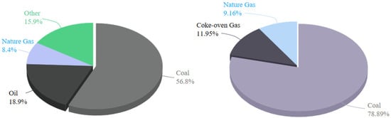 Compared to limited oil and gas reserves, China is rich in coal [52]. Therefore, coal is crucial for the supply of energy for development, and the maintenance of energy security [53,54,55]. To lessen its reliance on oil and gas, China has developed a coal-based chemical industry over the years [56,57]. In 2020, China’s coal consumption was 2.829 billion tons, accounting for 56.8% of China’s total energy consumption (Figure 2), and 54.33% of global coal consumption [58,59]. With abundant coal resources, more than 78% of the methanol consumed in China was produced from coal, based on gasification and synthesis processes (Figure 2). Thus, with such a large volume of coal and methanol production, China could minimize its dependency on oil by expanding the use of coal-based methanol to fuel vehicles [32,56]. According to the “Strategic Energy Action Plan” [60], the application of methanol made from coal (especially low-quality coal) to vehicle fuel could reform the coal industry by reducing overcapacity and increasing efficiency [14,61,62,63].