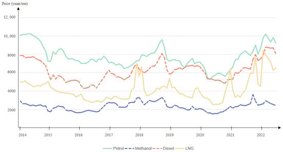 The quantity and price advantages of coal makes coal-to-methanol a competitive fuel in China [32]. Figure 3 compares the price of different vehicle fuels in China. According to the results of a methanol vehicle pilot project, compared to gasoline and compressed natural gas, taxis using dedicated methanol reduced their fuel costs by 37.5% and 10.6%, respectively [51]. The cost of fuel additives was around 10 USD per ton, no more than roughly 5% of the total cost of the methanol fuel [64,65].