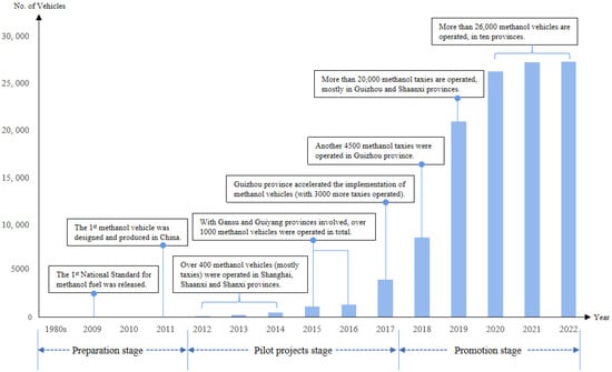 China started research on methanol vehicles in the 1980s and accelerated the research in the late 2000s to promote economic development and environmental friendliness [30]. According to the summarized policies (Table A1), the deployment of methanol vehicles in China can be divided into three stages (Figure 6). After a long preparation stage, the central government launched methanol pilot projects in five provinces from 2012 to 2017. With more than 25,000 taxis and heavy-duty vehicles using M100 as fuel in ten provinces, China has become a world leader in the application of methanol vehicles [30]. With the completed pilot projects demonstrating the technical maturity of methanol vehicles and their competitive economic advantages, the government aimed to continue developing methanol vehicles in coal-resource-endowed provinces [50,51]. This section reviews three stages of policies adopted for methanol vehicles’ deployment and their implementation from national to provincial levels.