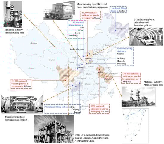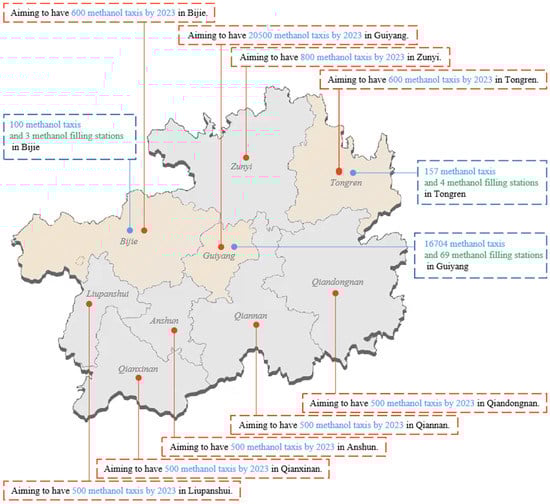 Guizhou province, which is capable of producing vast coal-based methanol, has been deploying methanol fuels and methanol taxis since 2010 [102]. Consequently, Guizhou was selected to start a pilot project in 2015 [103]. Although the pilot project started late, Guizhou operated more than 2000 methanol taxis, accounting for 70% of China’s total. In addition, the Guizhou provincial government appointed enterprises to develop manufacturing bases and fuelling stations [104].