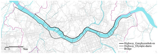 49]. In particular, in Seoul, many roads were scheduled to be undergrounded, and public spaces will be built on top of them because of the high land prices and public demand. Such restructuring can dramatically affect the area around the Hangang River [