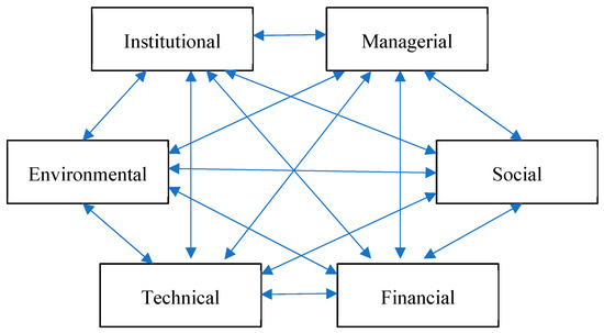 Studies on the assessment of the sustainability of water supply systems suggest determining criteria with certain factors, and these criteria can be generalized to form six dimensions, including (1) Institutional; (2) Managerial; (3) Social; (4) Financial; (5) Technical; and (6) Environment [15,30]. The dimensions are interacted with each other and can be shown in Figure 1.