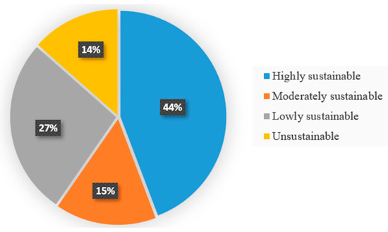 From the aggregate scores from Table 4, the assessment of the sustainability of each water system was undertaken based on the criteria given with respect to the result calculated from Equation (1) above as follows: