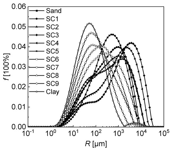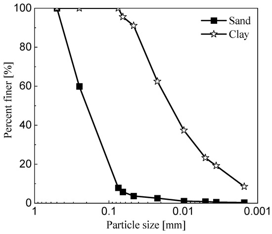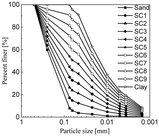 The experimental material used in this study was sand with a relatively uniform particle size (optimal particle size of 0.2 mm), and low-plasticity clay was used as the fine-grained material. The soil samples used in the experiment were first air-dried, crushed, and sieved, and then basic physical property tests were carried out. The physical parameters of the soil were obtained as shown in Table 1, and the particle size distribution curve is shown in Figure 1. The sand and clay were mixed in different mass fractions to obtain a series of composite soils with different fines content. The fines content used were 0%, 10%, 20%, 30%, 40%, 50%, 60%, 70%, 80%, and 100%, for a total of 11 composite soils. The mixtures with fines content of 0% and 100% were named sand and clay, respectively, and the other mixtures were named SC1, SC2, SC3, SC4, SC5, SC6, SC7, SC8, and SC9.