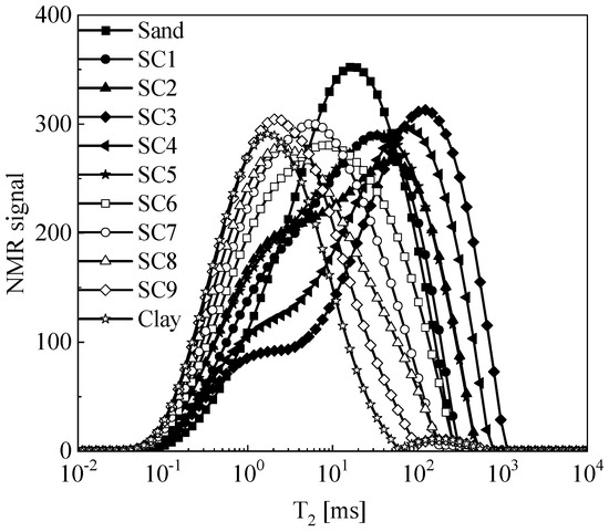 The principle of nuclear magnetic resonance (NMR) to obtain the pore size distribution curve is detecting the content and distribution of hydrogen protons in pore water in the soil. Hydrogen protons in pore water generate small magnetic moments due to their spin, which can be regarded as micro magnets. When a fully saturated soil sample is placed in a fixed magnetic field, all hydrogen protons tend to align along the direction of the magnetic field. At this time, a radiofrequency pulse is applied, causing the hydrogen protons to deviate under the interference pulse. When the radiofrequency pulse is stopped, the group of hydrogen protons that deviated will return from a non-equilibrium state to an equilibrium state, which is called relaxation. In geotechnical engineering, the transverse T2 relaxation (spin–spin relaxation) is usually used, controlling the phase shift of nuclear spins in a direction perpendicular to the applied static magnetic field. The abscissa of the obtained T2 distribution curve is the transverse relaxation time T2, and the ordinate is the nuclear magnetic signal corresponding to the T2 value, which characterizes the content of pore water at that T2. The peak area of the entire distribution curve represents the total pore water content in the soil sample [15,16]. Assuming that the soil meets the condition of fast diffusion and the soil pores are composed of cylindrical capillaries of different sizes, the T2 value of pore water is directly related to the pore size at which the pore water is located, i.e., [17],