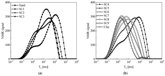 The T2 distribution curves of 11 saturated soil samples are shown in Figure 3. It can be seen from Figure 3 that with the increase in the fines content, the T2 distribution curve first moves to the right and then gradually moves to the left. To clarify the above trend more clearly, the experimental results in Figure 3 were redrawn at different fine-grained contents in Figure 4, where Figure 4a shows the T2 distribution curve under low fines content (fines content increases from 0 to 30%), and Figure 4b shows the T2 distribution curve under high fines content (fines content increases from 40 to 100%). From Figure 4a, the T2 distribution curve of pure sand has only one single peak, and the pore size distribution is relatively narrow. With the increase in fines content, the corresponding signals of smaller T2 values (in the range of 0.1–1 ms) increase, and at the same time, the maximum T2 value increases (gradually from 200 ms of sand), that is, the horizontal range of the T2 distribution expands, the vertical range decreases, and the curve becomes wider and shorter. The curve gradually changes from a single peak to a double peak and reaches the maximum width when the fines content increases to 30%. When the fines content exceeds 30% (Figure 4b), the T2 distribution curve moves to the left, the maximum T2 value decreases, and the signals of smaller T2 values increase further, making the curve narrower. The T2 distribution gradually changes from a double peak to a single peak. When the fine-grained content reaches 100% or clay, the T2 distribution is the narrowest.